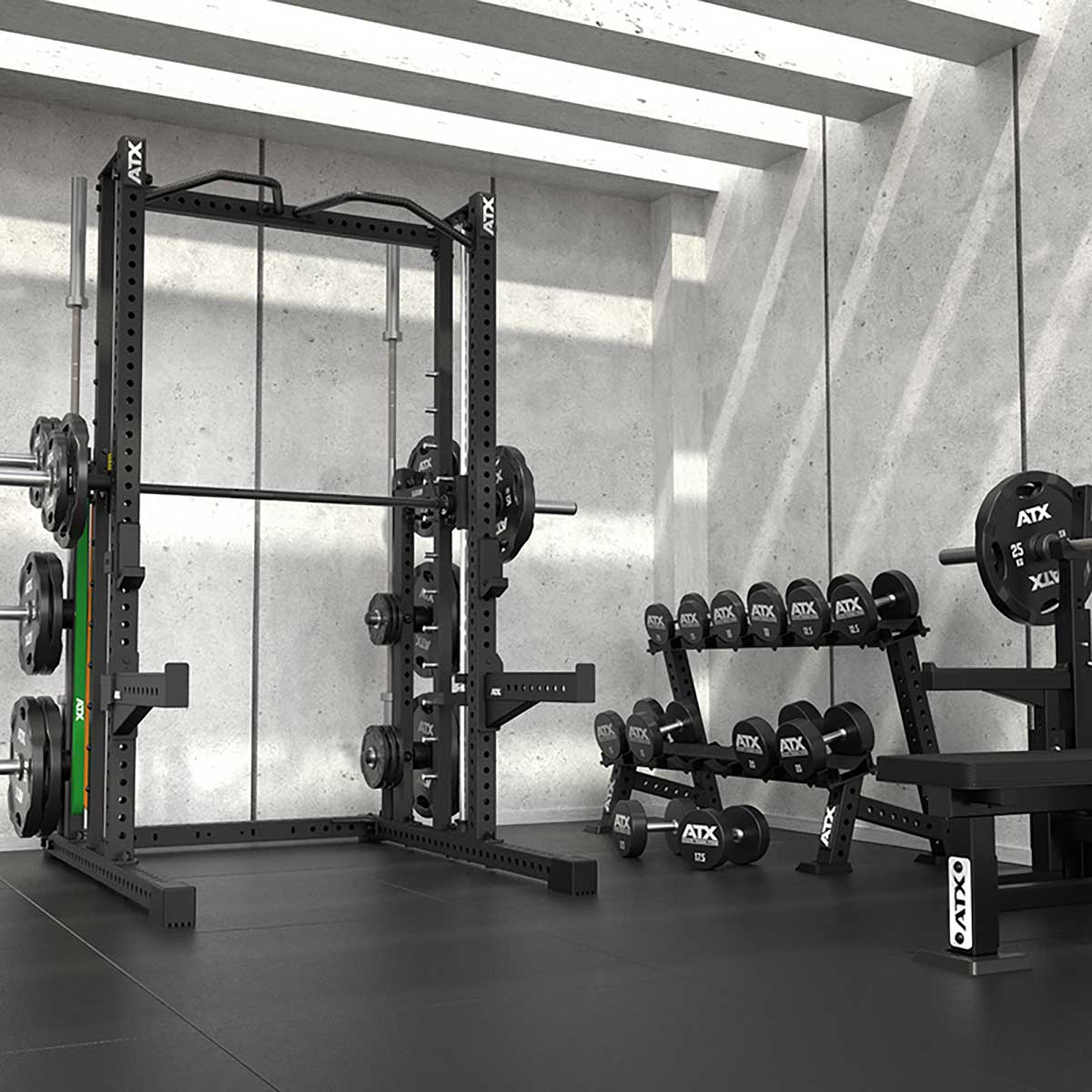 Alle relevanten Langhantelübungen können wahlweise frei am stabilen Half Rack oder präzise geführt an der seidenweich laufenden Multipresse ausgeführt werden.