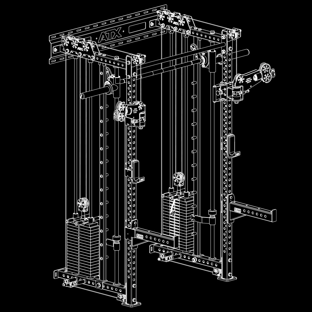 Diese erstklassige verarbeitete Kraftstation ermöglicht die Ausführung nahezu aller wichtigen Grundübungen im Kraftsport – von Klimmzügen, Kniebeugen, Bankdrücken und Nackendrücken - und das frei am Hantel-Rack oder an der linear geführten Multipresse! Die doppelseitigen Seilzüge ermöglichen alle relevanten Zugübungen von Oben und Unten und sind mit erstklassigen ATX® - XT-Armen (schwenkbare Auslegearme) ausgestattet, welche enge und breite Zugübungen (z.B. Cable-Cross) ermöglichen.