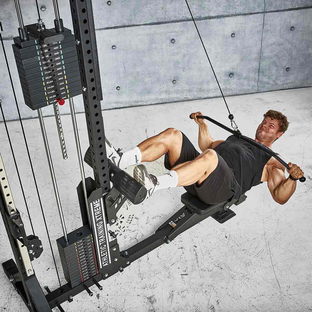 Der schwere Gewichtsblock mit 135 kg Steckgewichten erlaubt selbst starken Athletinnen und Athleten schweres Latzug- und Rudertraining für maximale Trainingsergebnisse.