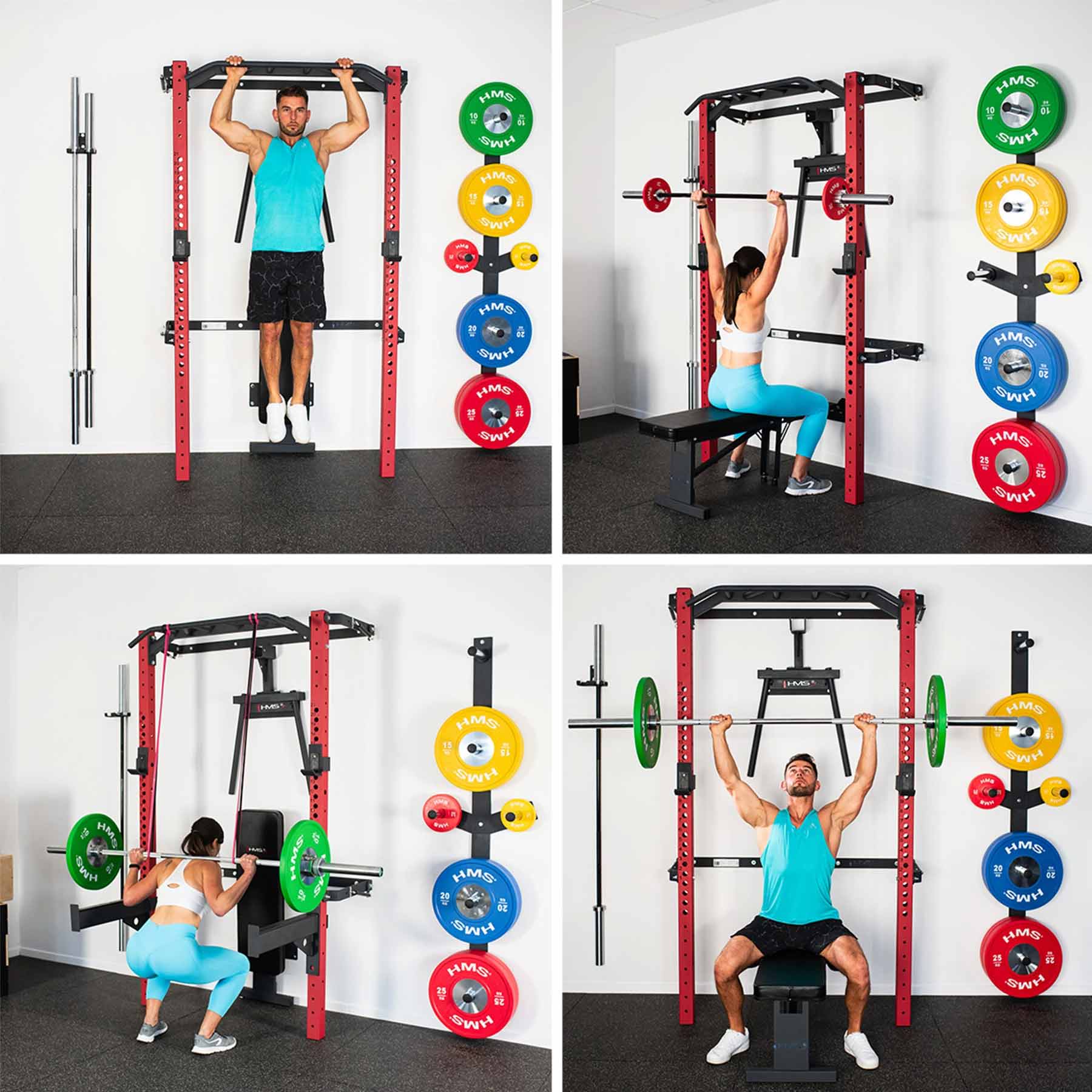 Diese Variante wird inklusive umfangreichem Zubehör geliefert. Neben der Klimmzugstange, Langhantelhaken und Sicherheitsstützen gehören eine klappbare Trainingsbank, eine Dip-Station, eine wandmontierte Gewichtsablage sowie eine Halterung für Langhantelstangen zum Lieferumfang. Das System erweitert das Trainingsspektrum deutlich und schafft gleichzeitig strukturierte Aufbewahrungsmöglichkeiten für die gesamte Ausrüstung.