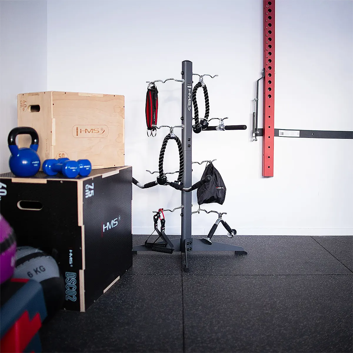 Perfekte Organisation für dein Training 💪Der STR33 verfügt über acht unabhängige Haken, an denen du verschiedenste Zubehörteile wie Griffe, Seile, Springseile, Widerstandsbänder und Functional-Training-Tools übersichtlich aufhängen kannst.