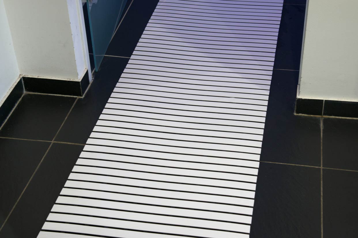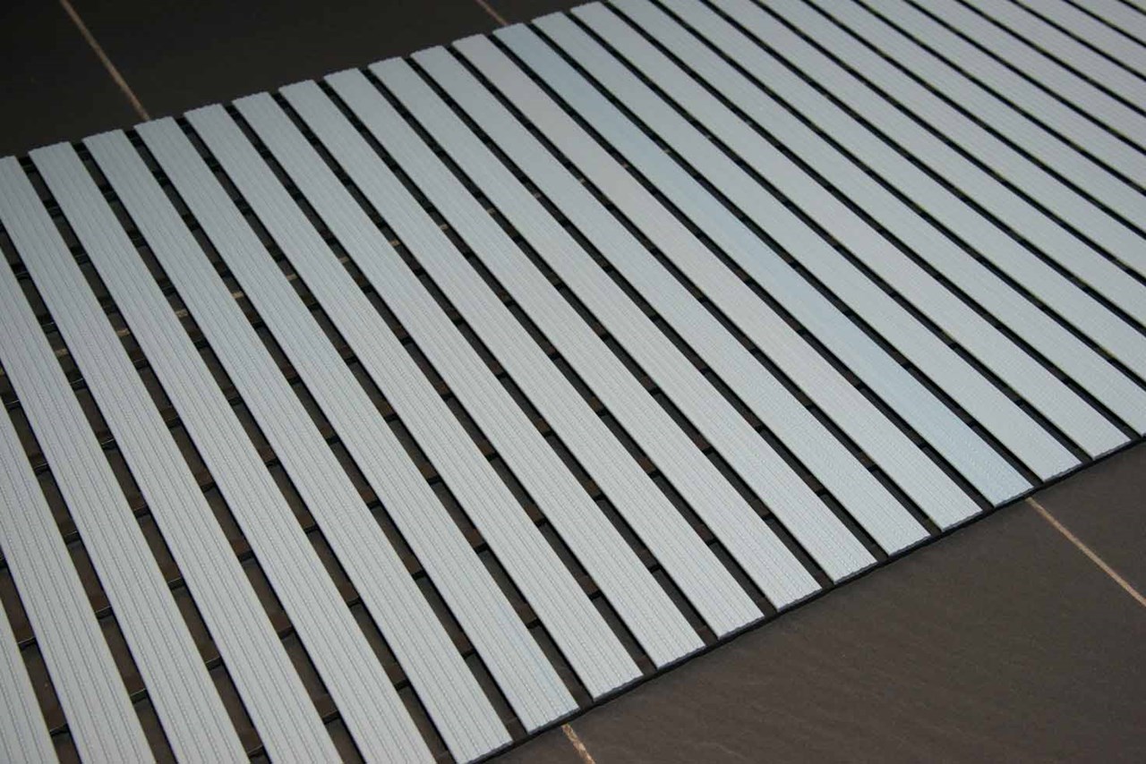 Das Unterprofil hat in regelmäßigen Abständen “Aussparungen”. Damit ist gewährleistet, dass zwischen den Profilen kein Wasser stehen bleibt und schnell verkeimt.Die langlebigen, aus hochwertig schlagzähem Hart-PVC bestehenden Oberprofile, liegen quer zur Laufrichtung. Die Matte verfügt über einen allseitigen Wasserablauf und liegt aufgrund ihres hohen Eigengewichtes von ca. 6 kg/m² gut auf dem Boden (kein Aufschwimmem).